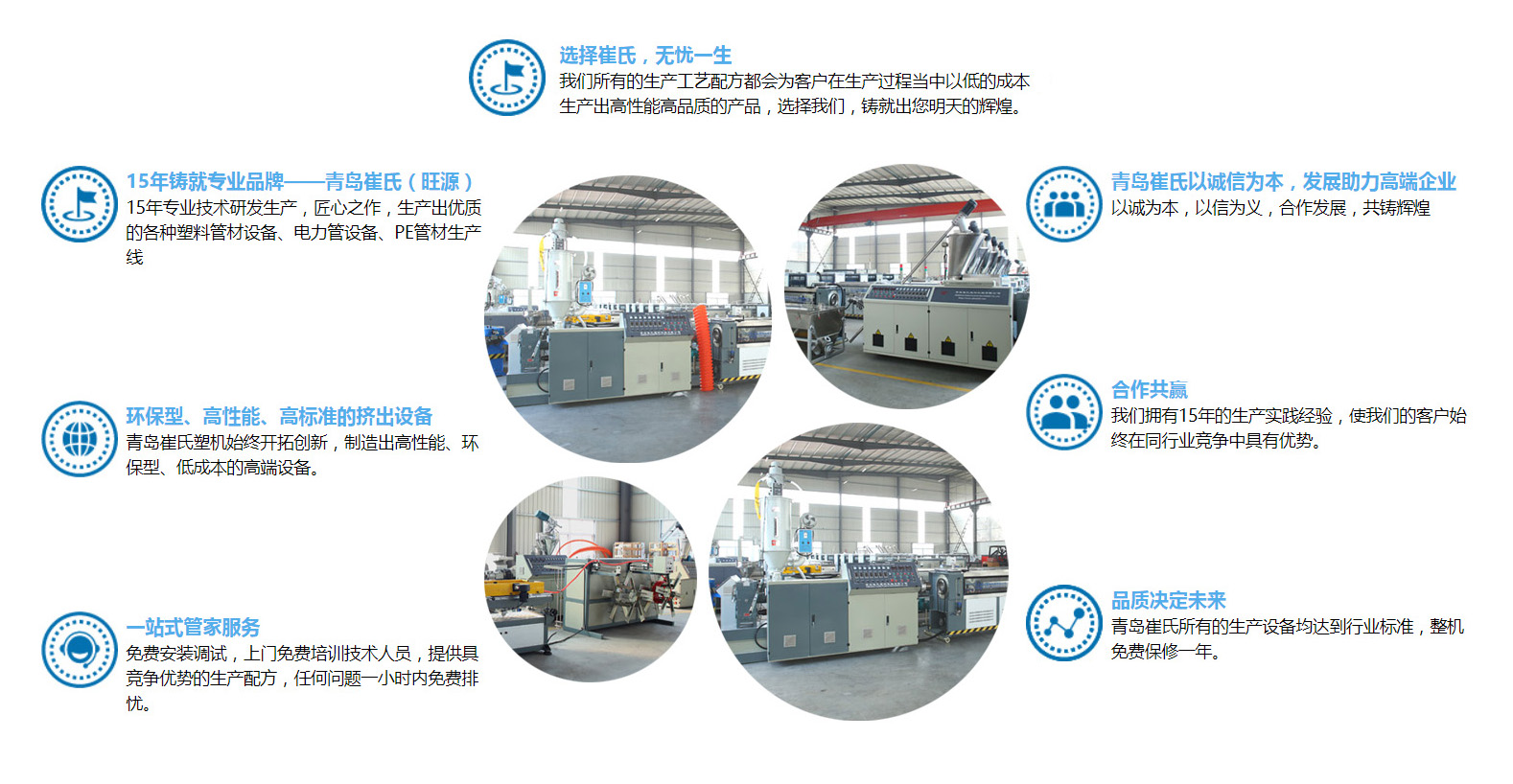 青島崔氏塑料機械有限公司始終以開拓創(chuàng)新的精神,緊跟世界塑機行業(yè)的發(fā)展趨勢,專注研發(fā)與生產(chǎn)預應(yīng)力波紋管全線設(shè)備,公司已有20多年的生產(chǎn)與實踐經(jīng)驗,在市場大環(huán)境下,緊跟國家發(fā)展趨勢,使我們的客戶在市場競爭中有一席之地,人生就是不斷決定的過程、決定沒有對與錯,只有得與失!選擇崔氏我們定不負卿。